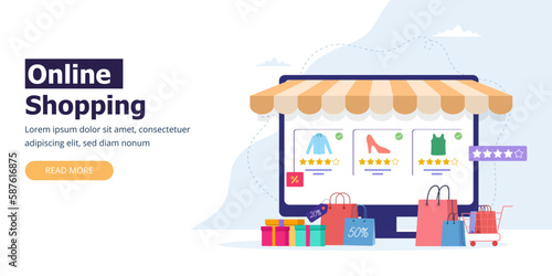 Online shop delivery service vector vstupní stránka šablony. Lidé si jídlo a oblečení objednávají na internetu pomocí mobilní aplikace a e-shopu ilustrace. Nakupování a doručování nákupů