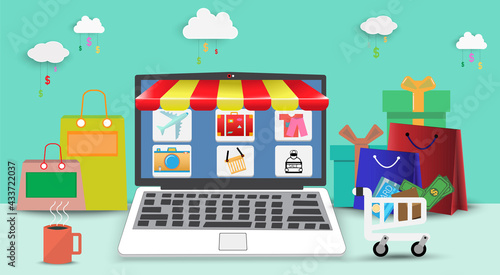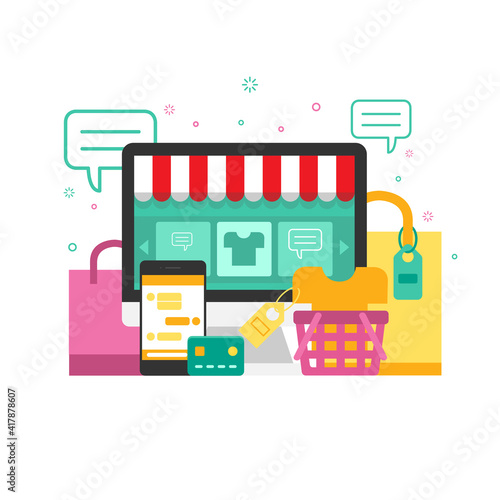 Internetový obchod vector plochý styl designu ilustrace. Mobilní telefon, notebook s markýzou, nákupní košík, taška, kreditní karta, lepenková krabice. Internetový obchod, koncept elektronického obchodu pro webový banner, webová stránka.