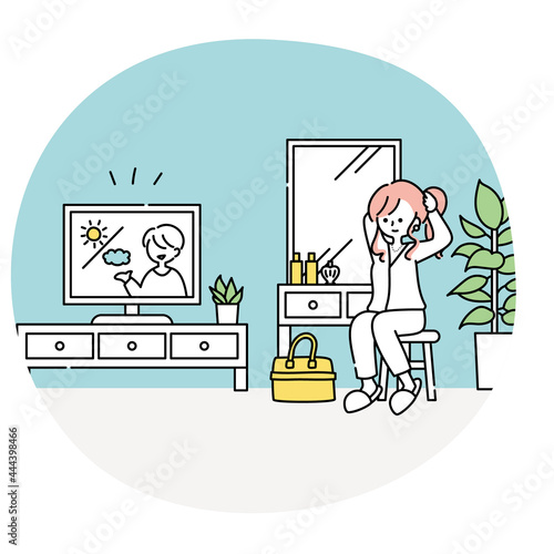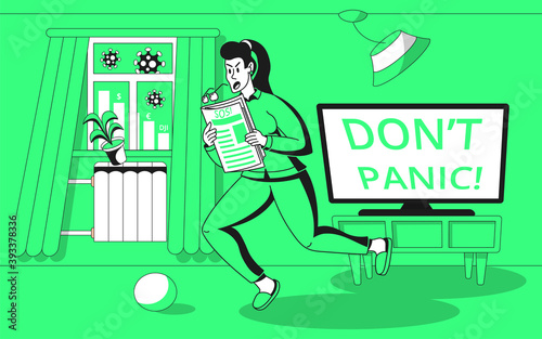 Online nakupování koncept vektorové ilustrace plochý styl designu. Dívka nakupování on-line na internetu zůstat doma. Interiér pokoje.