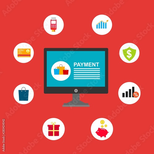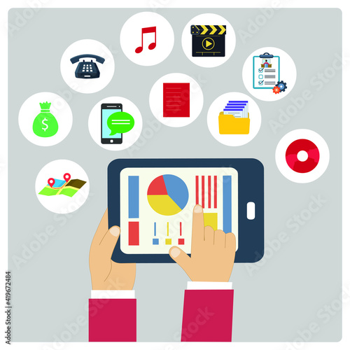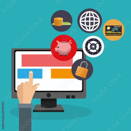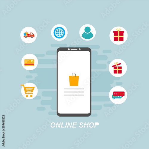 Online nakupování koncept vektorové ilustrace v plochém stylu designu. Ručně stiskněte tlačítko Koupit a objednat produkt na internetu.