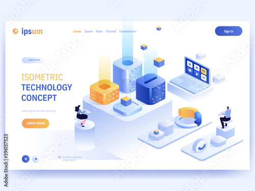 Online nakupování, design vstupní stránky, šablona banneru webových stránek, izometrická ilustrace plochého vektoru. Žena nakupuje potraviny, oblečení online. E-commerce, internetový obchod.
