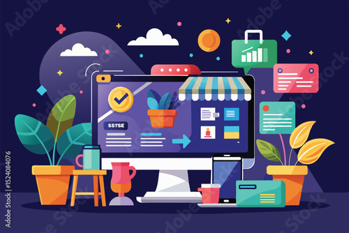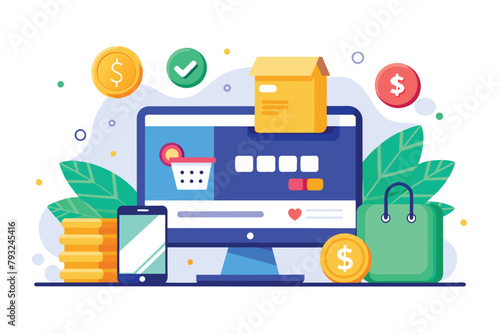 Nejlepší nabídky Online nakupování, vektorová plochá ilustrace. Dárková krabička, 70 procent hot prodej textu na velké obrazovce monitoru počítače a drobné znaky. Internetový obchod slevy koncept pro web banner atd.