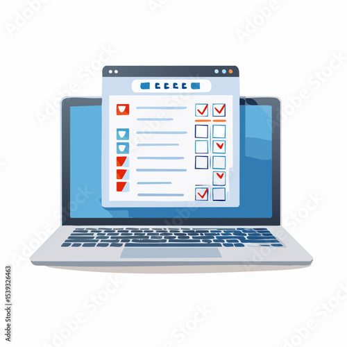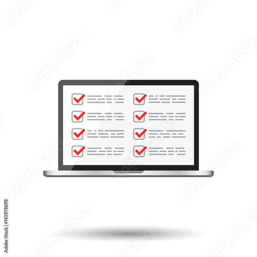 Notebook a mobilní telefon s zaškrtávacími políčky vyplněnými zaškrtávacími značkami. Vektorové ilustrace izolovaných na bílém pozadí. Online průzkum, koncept kontrolního seznamu.
