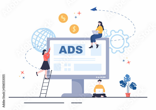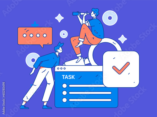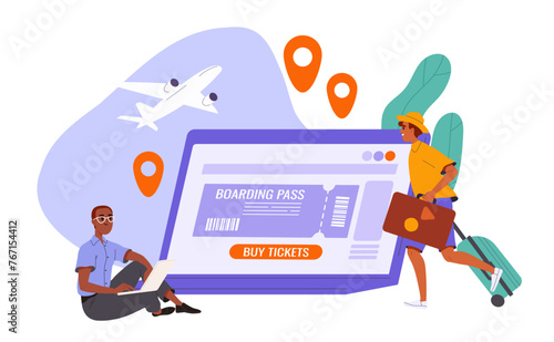 Online cestovní rezervace vektorové ilustrace. Cestovní kancelář vyhledávání letů a letenek, složení rezervace hotelů s mikro mužskými a ženskými postavami a obrovským notebookem pro webový banner, webová stránka