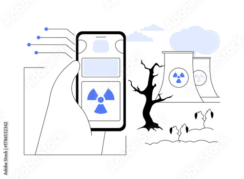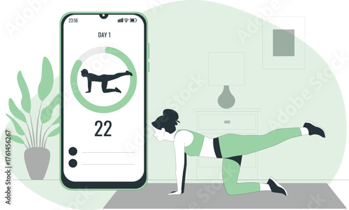 Dívka se sluchátky na uších a smartphone dělá warrior 2 jóga představují doma spolu s on-line trenér na mobilní obrazovce, vektorový plochý styl designu ilustrace. Online kurzy jógy a meditace.