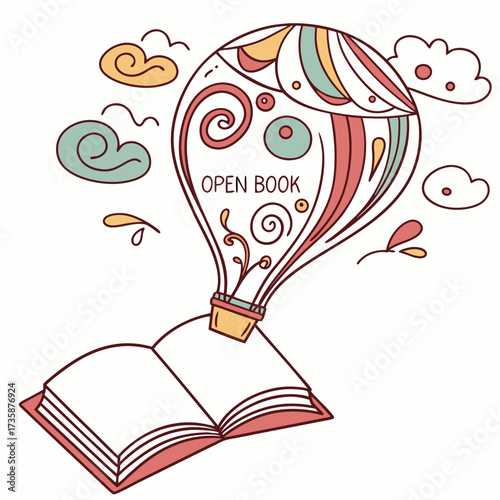 Otevřená kniha s romantickým párem v lásce létání v horkovzdušném balónu vysoko na obloze nad vrcholky hor. Vektorové ilustrace v papíru cut craft stylu. Koncept romantických milostných příběhů.