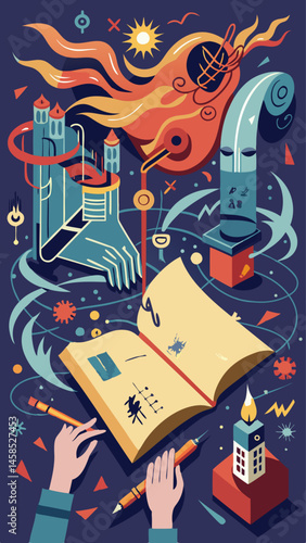 Vektor vrstvený papír střih styl Otevřená kniha se školní potřeby létání z něj. Vzdělávání dětí, znalosti, koncept zpět do školy.