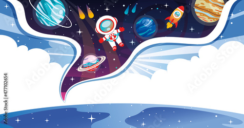 Otevřená kniha s hvězdnou oblohou, planety sluneční soustavy obíhající kolem Slunce, souhvězdí zvěrokruhu, vektorové ilustrace ve stylu papírového umění. Astrologie, astronomie věda, představivost, předpovědi horoskopu.