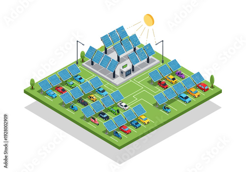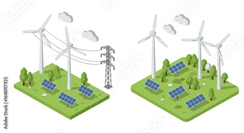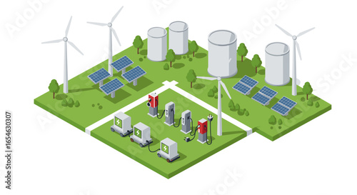 Bio. Skleník, větrné turbíny a solární panely, ploché vektorové izometrické ilustrace. Skleník využívající čistou energii ze slunce a větru. Zelená alternativní energie. Ekologická farma.