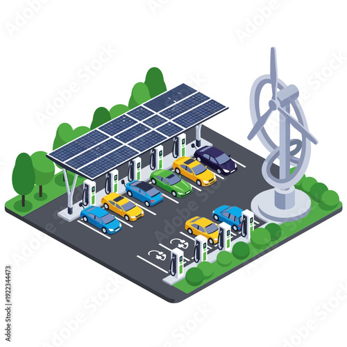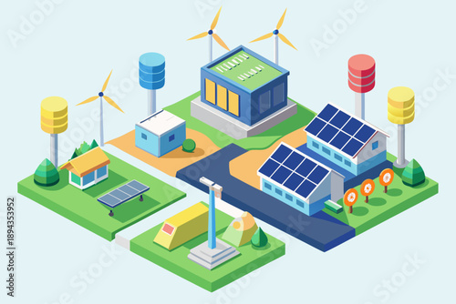 Bio. Skleník, větrné turbíny a solární panely, ploché vektorové izometrické ilustrace. Skleník využívající čistou energii ze slunce a větru. Zelená alternativní energie. Ekologická farma.