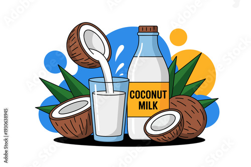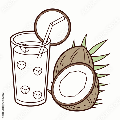 Kokosová voda vektorové ilustrace. Realistické složení organického nápoje v hliníkových plechovkách, kokosech,palmových listech na plakát, banner atd. Osvěžující balení kokosové šťávy.