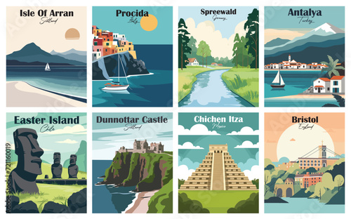 Venkovní krajiny s backpacking pár. Muž a žena cestují po světově proslulých přírodních památkách. Vektorové sady ilustrací. Horské jezero, Grand Canyon, vzdušné balony nad Kappadokií v Turecku.