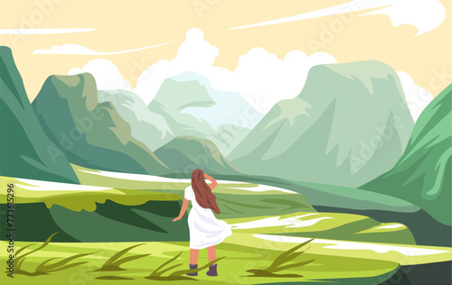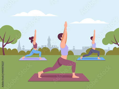 Venkovní Jóga V přírodě horské krajiny. Jóga cvičení koncept vektorové ilustrace. Muž a žena trénují společně, kreslené postavičky. Zdravý životní styl, sportovní aktivita.