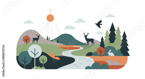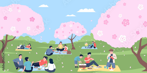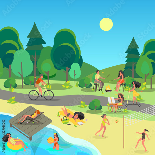 Skupina dívek relaxujících v přírodě cvičí jógu, medituje, tančí kolem ohně, plochá vektorová ilustrace. Venkovní jóga, meditace, všímavost, zdravý životní styl, retreat tour.