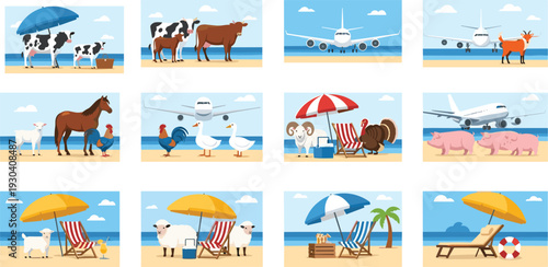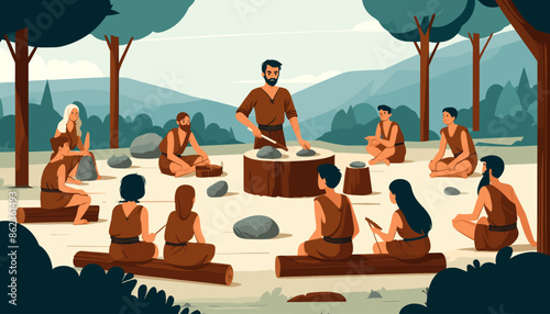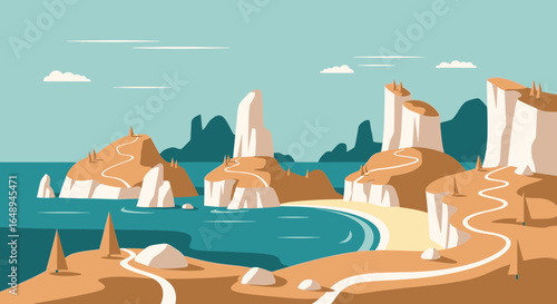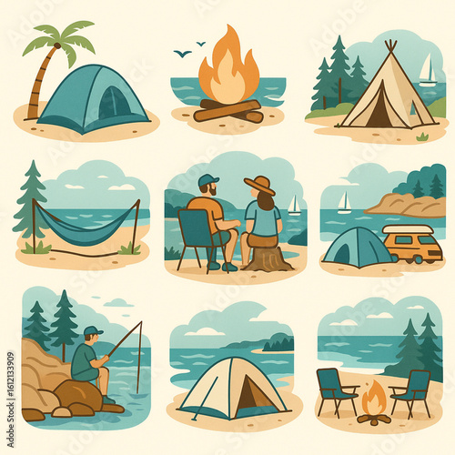 Venkovní jóga koncept vektorové ilustrace. Žena a muž trénují společně na pláži. Zdravý životní styl, rekreace. Lidé meditují v lotosové józe. Ranní meditace v krásné krajině