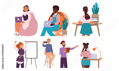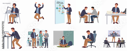 Stresovaný vyčerpaný unavený podnikatelé na pracovišti, vektorové ploché izolované ilustrace. Přepracovaní stresovaní lidé sedí u stolů, hádají se mezi sebou, drží znamení nápovědy. Emocionální vyhoření.
