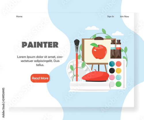Šablona vstupní stránky malíře. Koncept designu vektorového plochého stylu pro web umělce a vývoj mobilních stránek. Malířské nástroje a příslušenství.