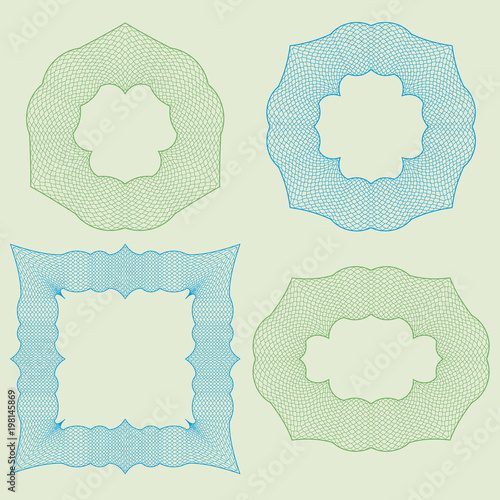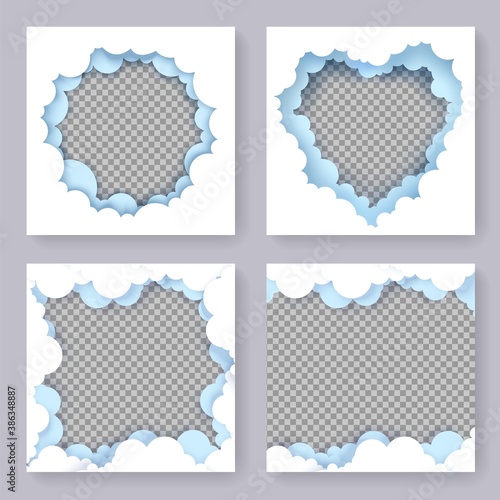 Papír cut craft styl rám set, vektorové ilustrace. Díra na obloze. Srdce, kruhové, čtvercové otvory v bílých načechraných oblacích.