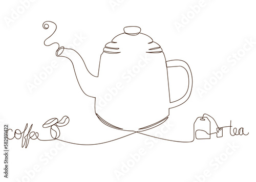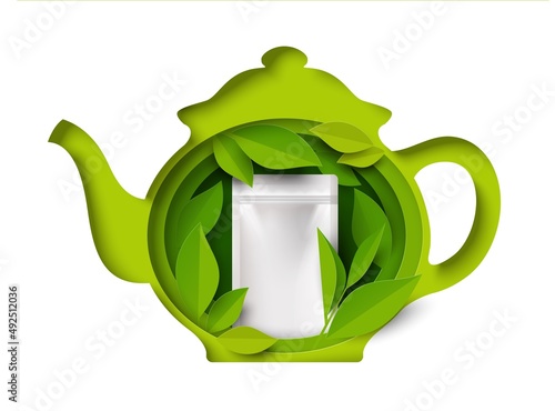 Papír řezané konvice se zelenými listy a realistický čajový sáček uvnitř, vektorové ilustrace. Maketa značky zeleného čaje, reklama.