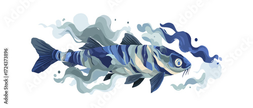 Paper cut craft style podvodní mořská jeskyně s rybami a potápěč silueta plavání s potápěčskou baterkou, vektorové ilustrace. Krajina podmořského světa. Potápění plakát banner design šablony.