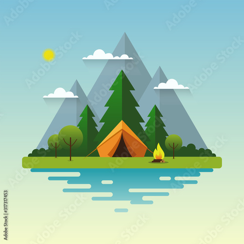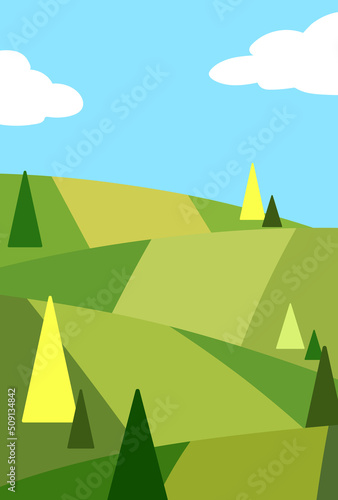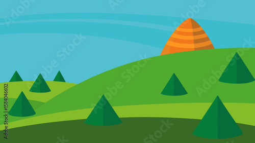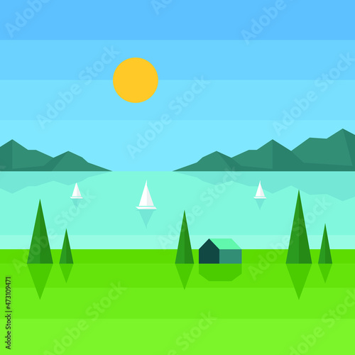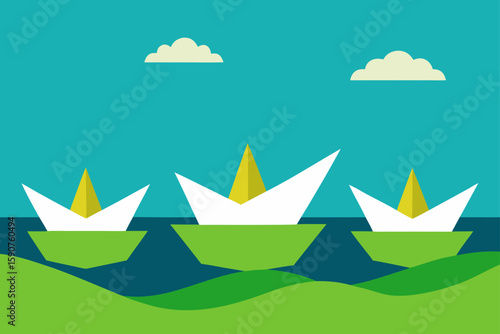Stáhnout obrázek Papercut nature. Horská krajina 3D umění vektor. Origami Jarní pole prostředí s trávou půdy, nebe a skalní vrchol, loď plovoucí v řece ilustrace