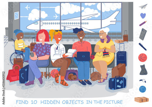 Cestující cestující letadlem, ploché vektorové ilustrace. Turisté, šťastný pár, matka s dcerou sedí v pohodlných sedadlech uvnitř letadla. Interiér letadla. Letadlo.