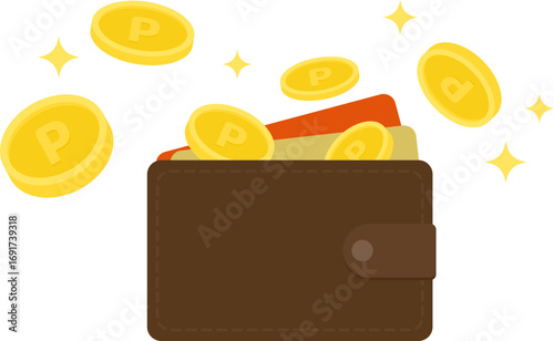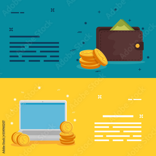 Koncept pasivního příjmu. Kreslené vektorové ilustrace. Peněženka s dolarovými zlatými mincemi.