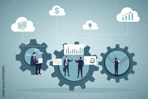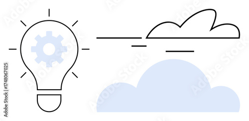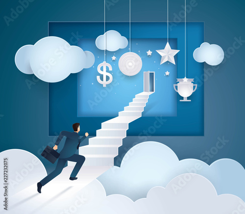 Podnikatel chůze po schodech vedoucích k žárovce s ozubenými koly, ozubená kola na konci, vektorové vrstvené papír řezané styl ilustrace. Cesta k nápadu, cesta k úspěchu koncept pro plakát, banner atd.