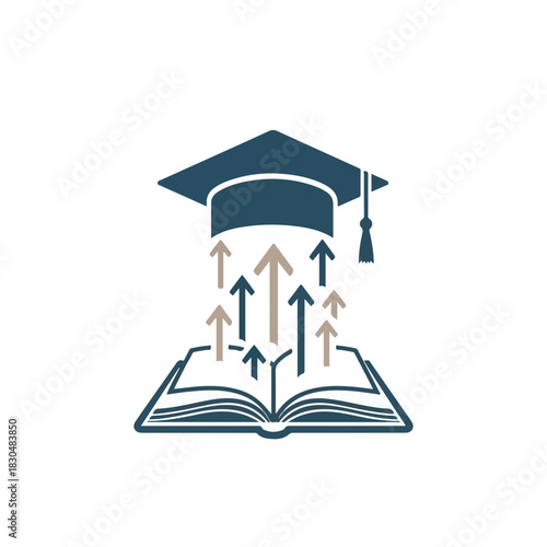 Podnikatel chůze po schodech vedoucích k trofej pohár a promoce klobouk na konci, vektorové vrstvené papír střih styl ilustrace. Cesta ke znalostem, koncept profesního růstu pro plakát, banner atd.