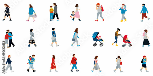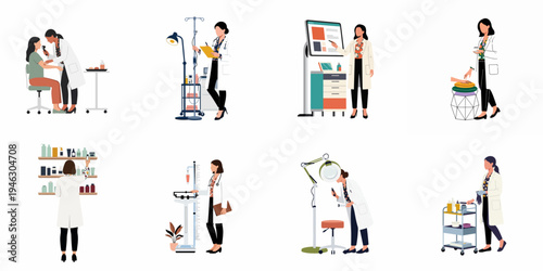 Pediatr lékaři a pacienti, ploché vektorové izolované ilustrace. Rodiče s dětmi navštěvující lékaře. Lékař zkoumá děti. Dětská lékařská prohlídka. Medicína a zdravotní péče.
