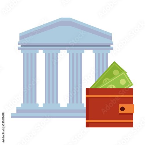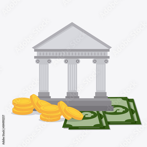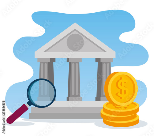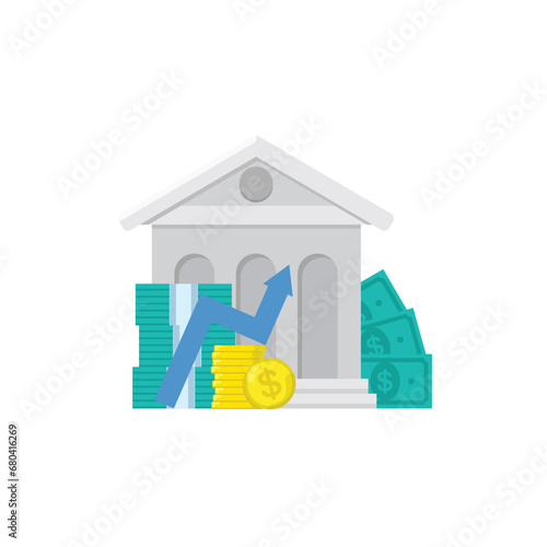 Penzijní fond koncept vektorové ilustrace v plochém stylu designu. Financování investic a úspory pozadí s bankovní fasádou a peněžními mincemi.