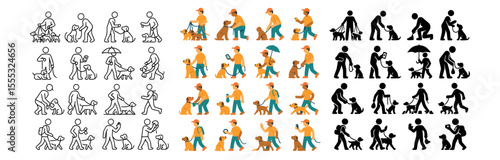 Lidé a různé domácí zvířata izolované vektorové sady. Muž a žena majitel znaky držení, objímání a péče o psa, kočka, ryba, papoušek, chameleon a krajta ilustrace
