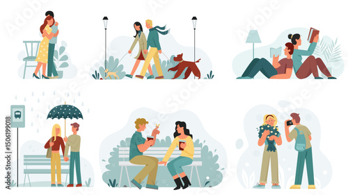 Skupina lidí se těší jejich koníčky vektorové ploché ilustrace. Šití, keramika, pletení, sochařství, sbírání motýlů, baletní tanec, hra na saxofon, Malba a amatérské divadlo.