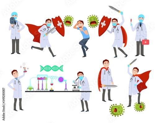 Pacienti, mužské a ženské postavy ukazující stop hand sign lékaři s injekční stříkačkou, ploché vektorové ilustrace. Lidé proti vaxxerům, kteří odmítají injekci vakcíny covid-19. Váhání s vakcínou. Anti vax.
