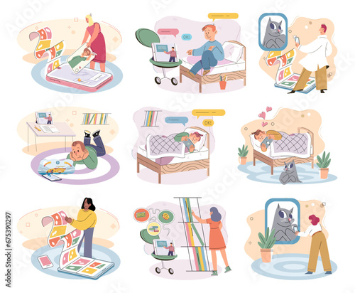 Lidé obchodní komunikace virtuální chat vektorové ilustrace. Online videokonference, vzdálený briefing cmpny, setkání týmu kolegů přes internet a koncept vzdálené práce