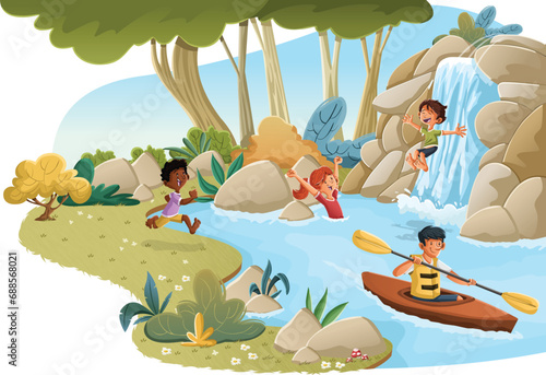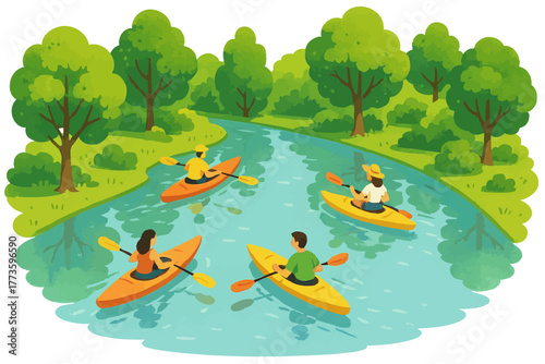 Lidé kempují na řece a sedí u ohně. Kemp s ohněm, stanem a kánoí. Vodní dobrodružství sport vektorové ilustrace. Muž a žena odpočívají po raftingu, jízdě na kajaku, kanoistice.