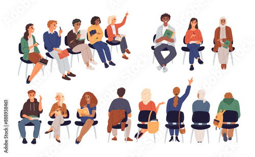 Skupina lidí fandění, zatímco sedí, stojící, zadní pohled ploché vektorové ilustrace. Sportovní fanoušci, diváci televizních pořadů, diváci koncertních akcí, akademické hlediště.