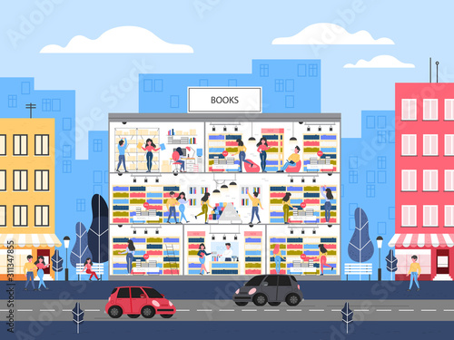 Lidé uklízí obchod, zatímco zákazníci nakupují. Vektorové ilustrace v plochém retro stylu. Péče o podlahu a úklidová služba v supermarketu.