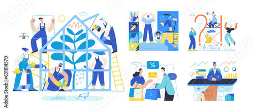 Lidé sní scéna set, ploché vektorové ilustrace izolovaných na bílém pozadí. Zasněný muž, ženské kreslené postavičky relaxaci doma a myšlení sedí v křesle, u okna, čtení knihy.