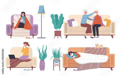 Lidé sní scéna set, ploché vektorové izolované ilustrace. Zasněné mužské a ženské kreslené postavičky přemýšlet o něčem při relaxaci doma, procházky se psem, práce na počítači.