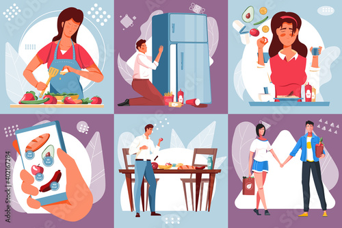 Lidé se těší jejich koníčky vektorové ploché ilustrace. Květinové zahradnictví, vaření, stavba modelů nebo výroba modelů letadel a lodí.