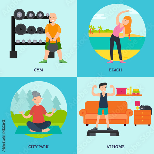 Lidé se těší jejich koníčky vektorové ploché ilustrace. Golfová hra, karaoke zpěv, fotografování a vyšívání. Sport, Hudba, Umění a řemeslné koníčky.