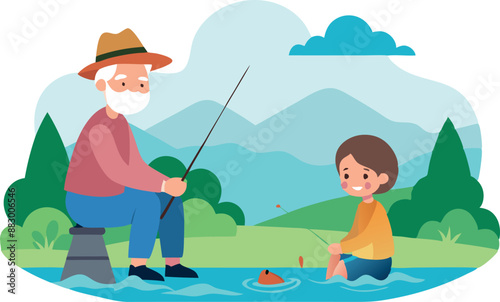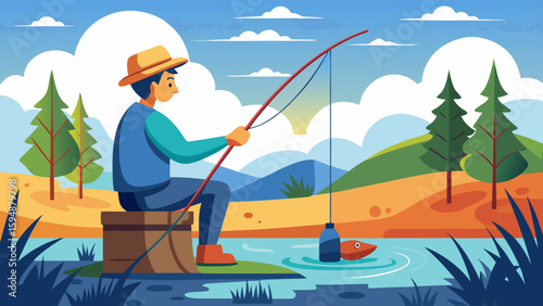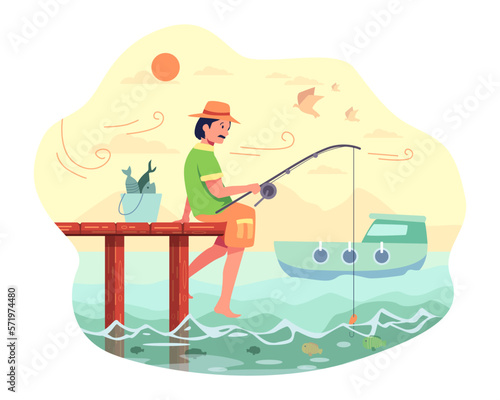 Lidé loví v rybníku, jezero nebo řeka set. Mladý nebo dospělý svobodný muž, otec a syn chytání ryb s přívlačovým prutem vektorové ilustrace. Mužský koníček a rekreační čas