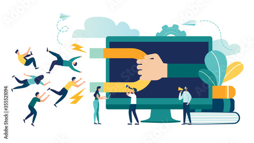 Žena s megafonem stojící na obrovském smartphonu a lidé, kteří mají rádi srdce, hvězda, palec nahoru symboly, plochá vektorová ilustrace. Komentáře sociálních médií, zpětná vazba od zákazníků, dobrá recenze, hodnocení.