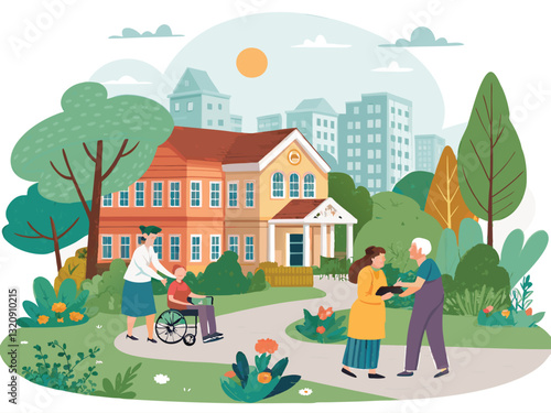 Lidé grilují, jedí maso, klobásy, pijí pivo, hrají na kytaru, odpočívají a baví se, plochá vektorová ilustrace. Letní grilovací párty, venkovní piknik, rodinné grilování na zahradě.