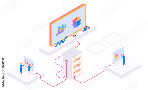 Lidé pěstují srdce v květináčích, buďte laskaví, test struktury krve, izometrická ilustrace plochého vektoru. Charita, pomoc, dobrovolnictví, dárcovství krve.