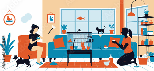 Lidé, kteří pěstují rekreační konopí a používají produkty CBD doma, Ilustrační obrázek flat vector. Ženské postavy zalévají rostliny marihuany, meditují a kouří plevel, muž kouří z bongu.