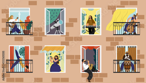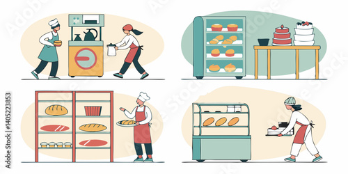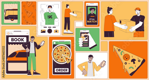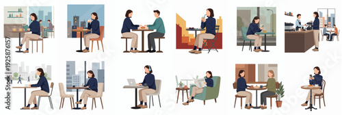 Lidé v knihkupectví nebo knihovně concept vector set. Žena sedící v křesle a červené knize. Ručně kreslená ilustrace. Hromada knih, knihovna nebo knihkupectví interiér.