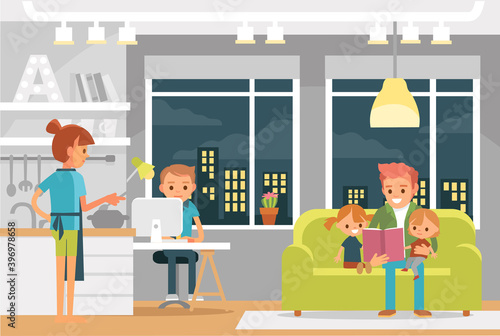Lidé v bus vector concept ilustrace. Městské veřejné ptransport interiér, sedící a stojící cestující. Lidé dojíždějí autobusem.