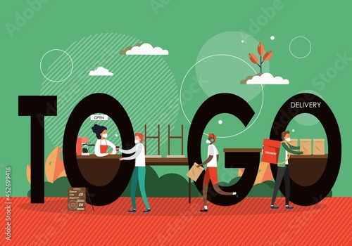 Lidé v obličejových maskách kupují jídlo s sebou a kávu, ilustrační foto. Karanténa koronavirů, omezení blokování. Kavárna, Restaurace práce otevřená pro online doručení a objednávky s sebou.